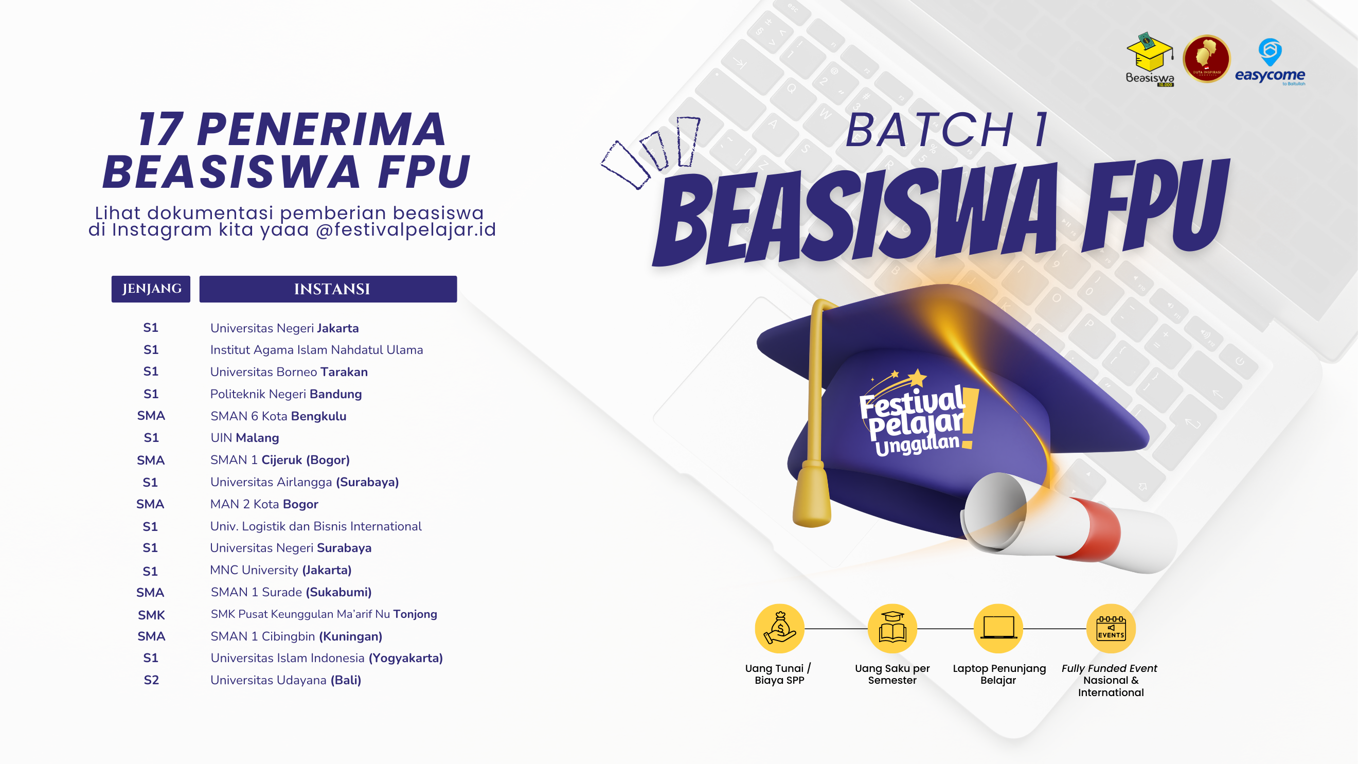 FPU mengucapkan selamat kepada seluruh penerima Beasiswa FPU Batch 1. Semoga program ini dapat menjadi motivasi untuk terus berkarya, berkembang, dan memberikan kontribusi positif bagi masyarakat dan bangsa.